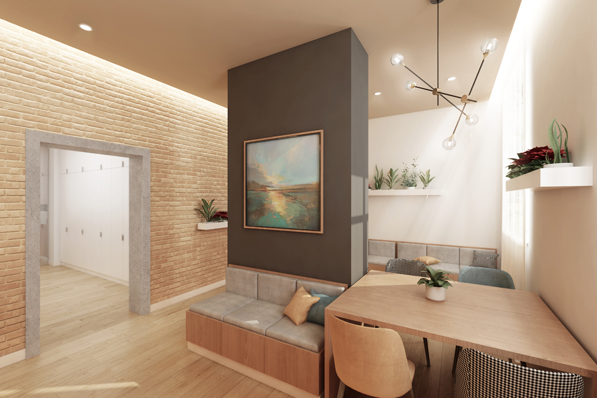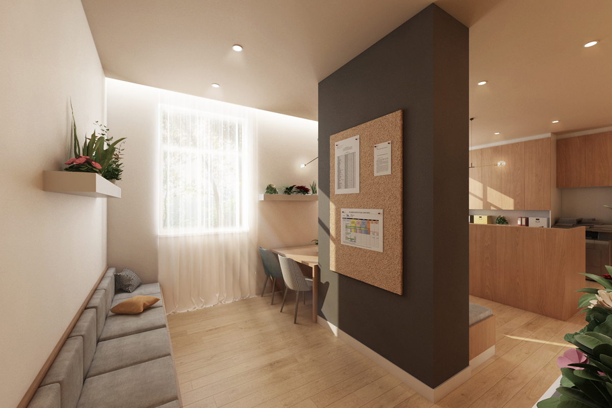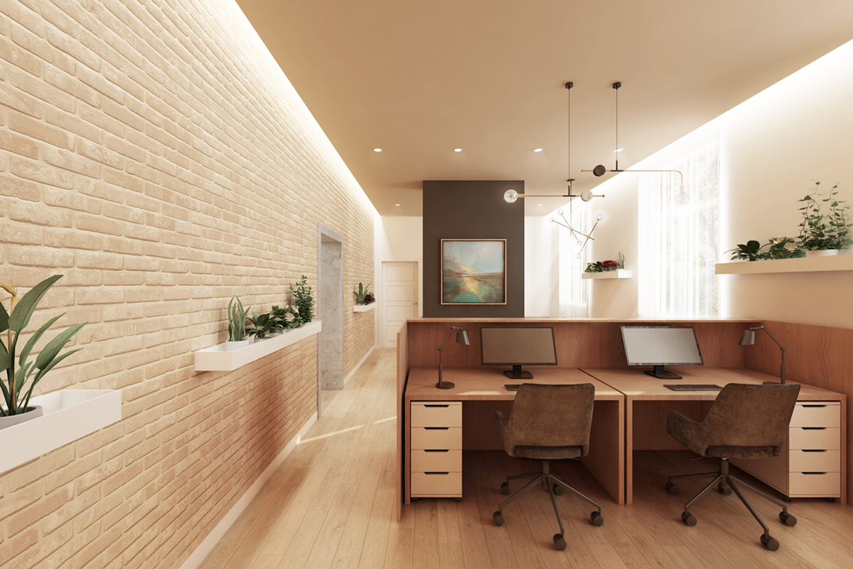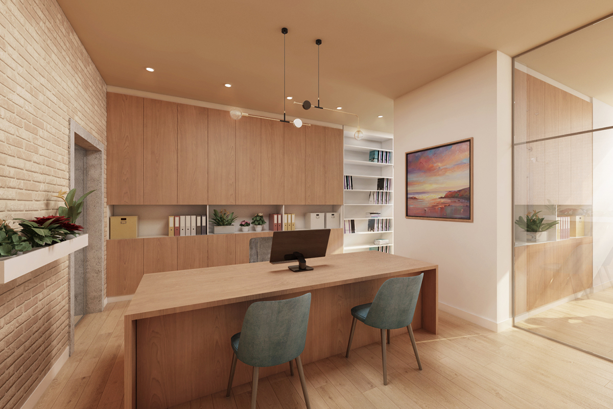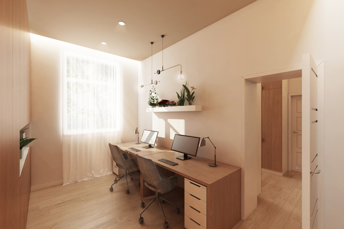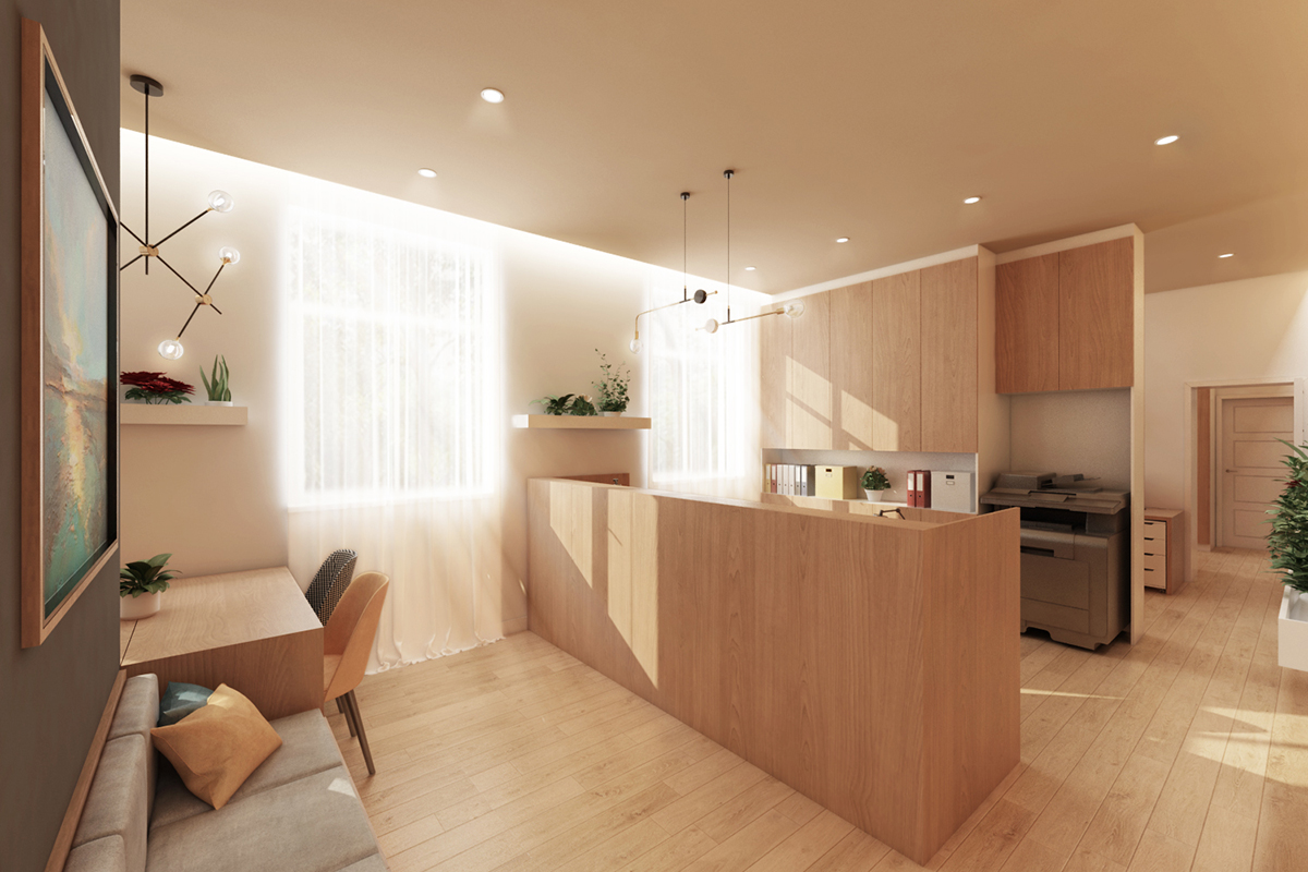 Irina e notar, om pasionat, onest, cald. S-a lăsat pe mâinile și mințile noastre cu cea mai mare încredere, noi ne-am inspirat din personalitatea ei și i-am imaginat un spațiu luminos, deschis, confortabil, unde ea și echipa ei să lucreze eficient, să interacționeze plăcut cu clienții, și, pe alocuri, să simtă familiaritatea unui “acasă”, îngrijind mult-doritele plante sau lecturând ceva pe canapea.