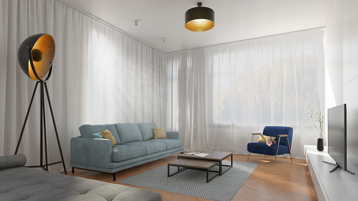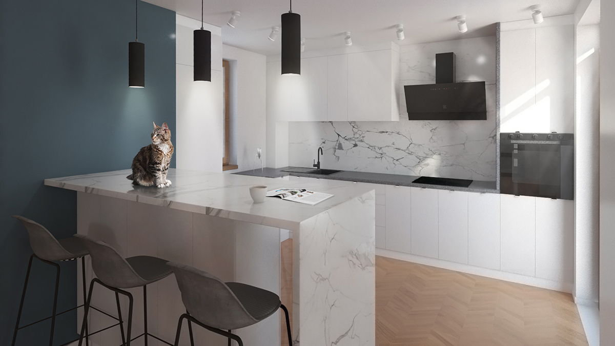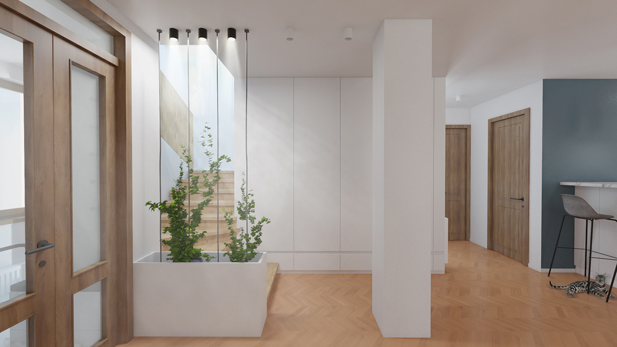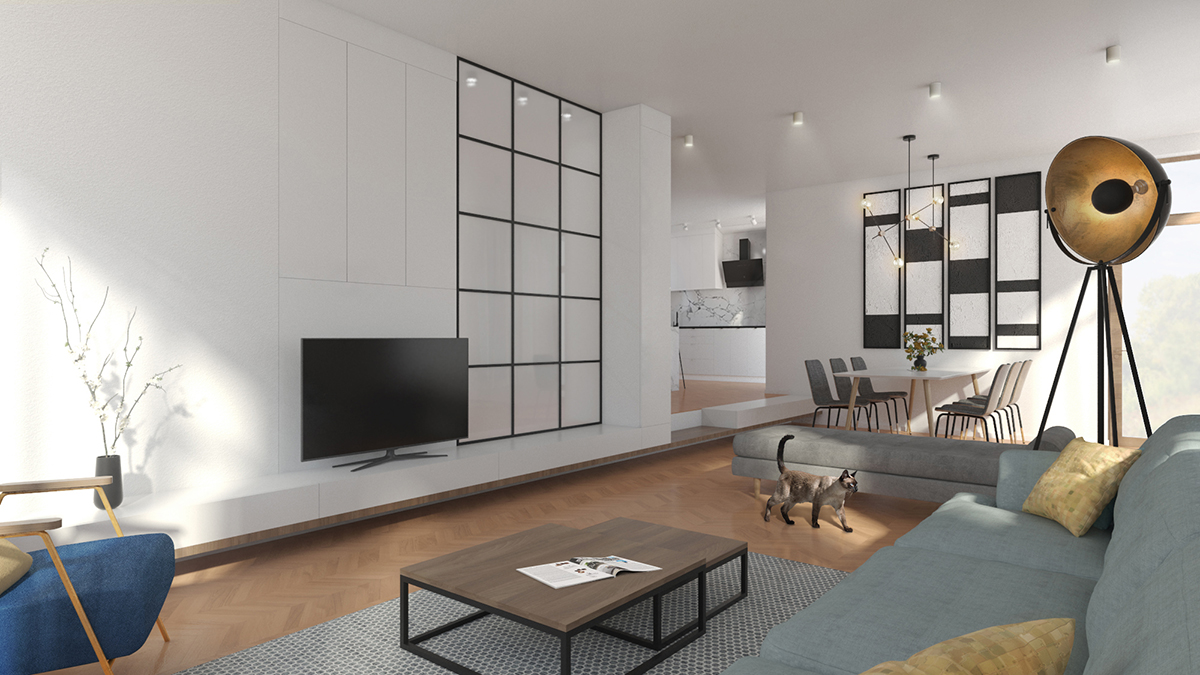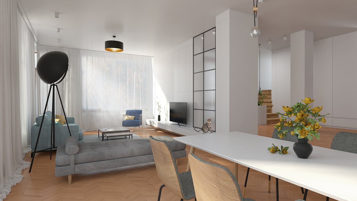 Zona de zi a unei astfel de locuințe este “terenul de joacă” pentru imaginația noastră și pentru niște pisici. În spațiul pe care l-am găsit pare că cineva a vrut să-și etaleze talentul în realizarea finisajelor interioare și a pus de toate. Tavane pline de scafe la diverse înălțimi, rectangulare și sub formă de amibă, culori și texturi în asocieri bizare, toate au dispărut pentru ca pe o “foaie albă” să poată apărea imaginea unui alt stil de viață. Totul a devenit mai simplu, mai uniform, mai curat, mai eficient, cu accente de culoare calme și folosite cu sens.