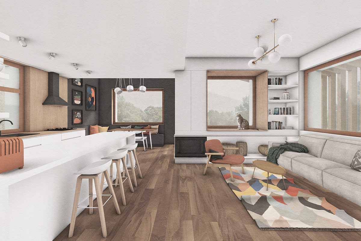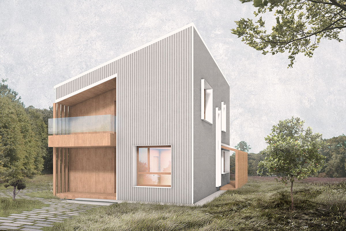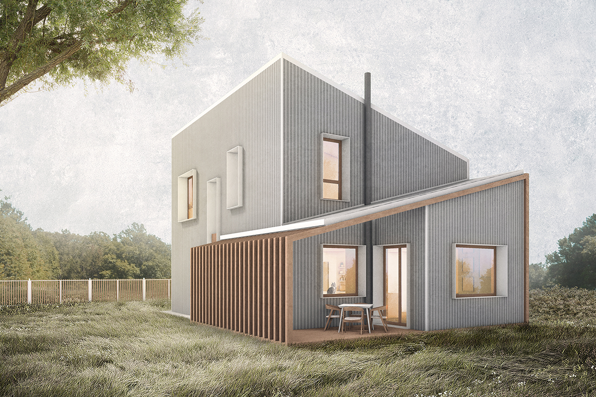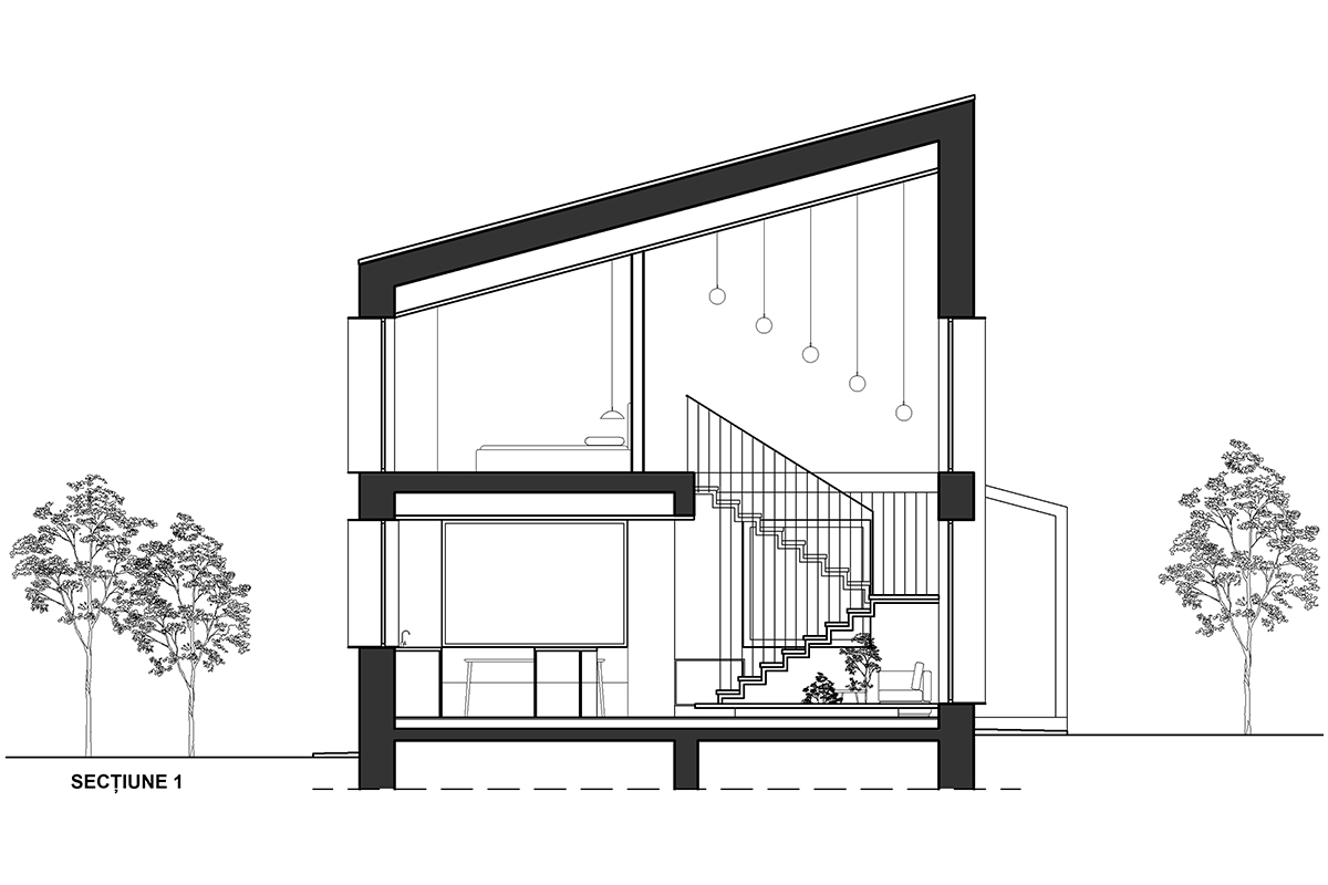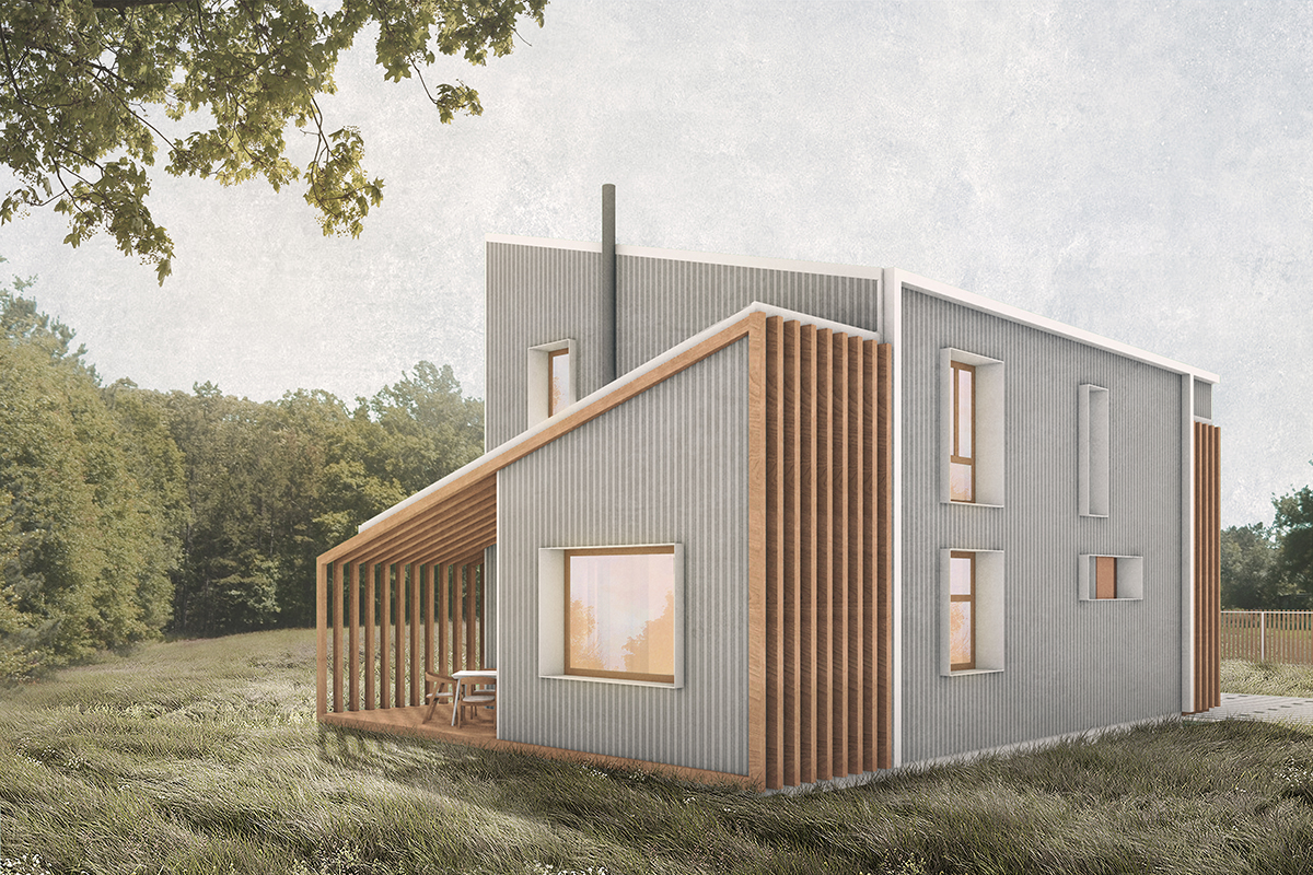 Un volum simplu, ușor de întreținut, eficient, acoperit cu tablă și lemn, adăpostește un acasă fără spații inutile, dar cu spațiu suficient și luminos, croit pe măsura și bucuria familiei.