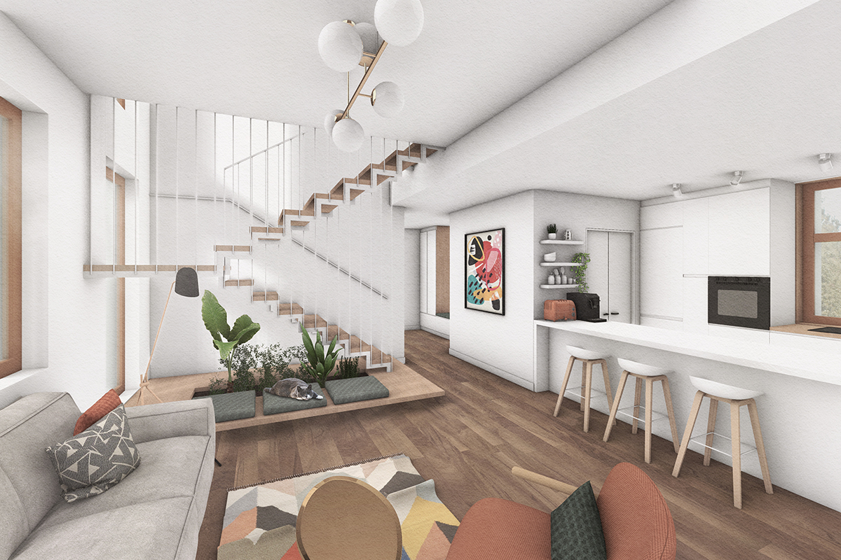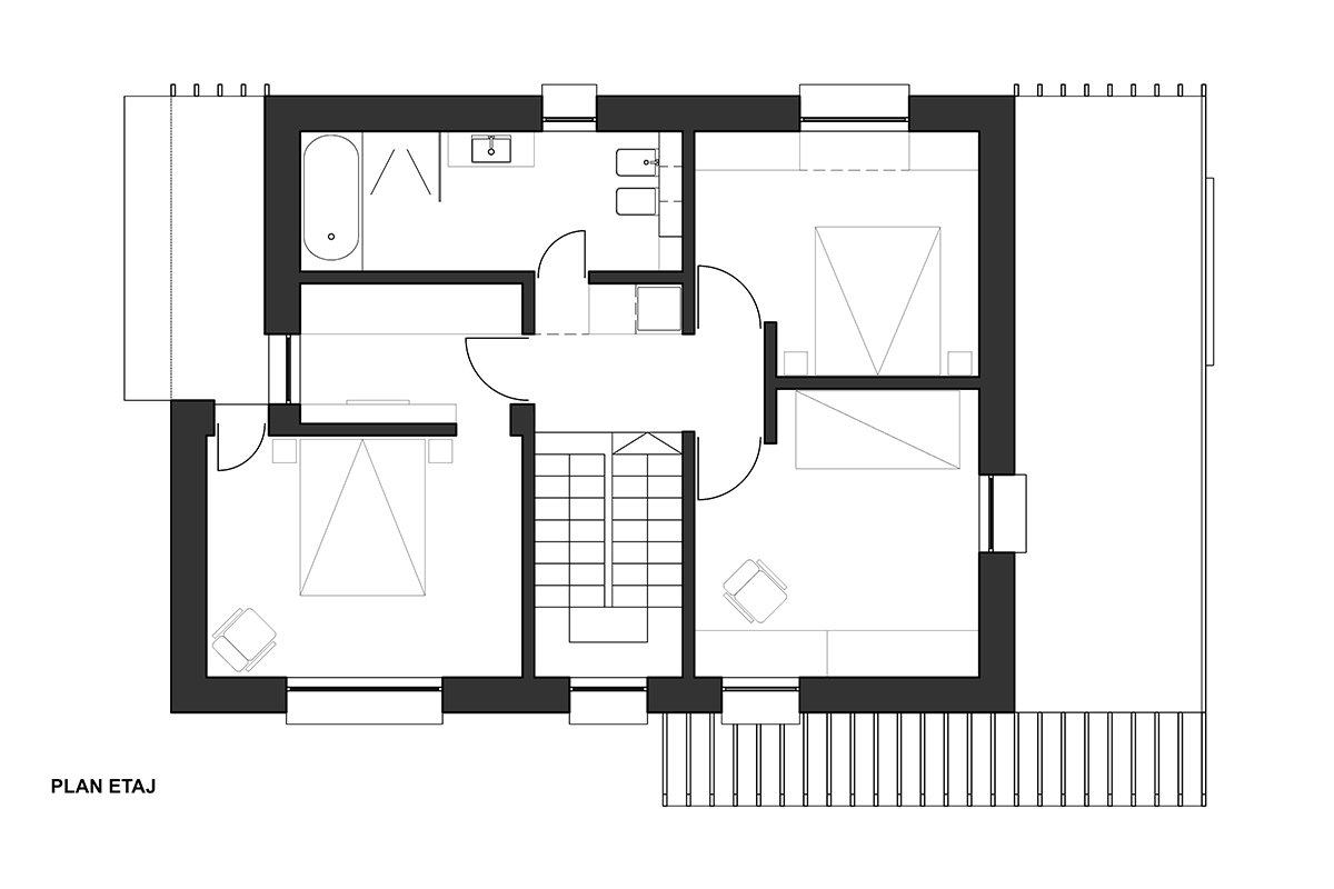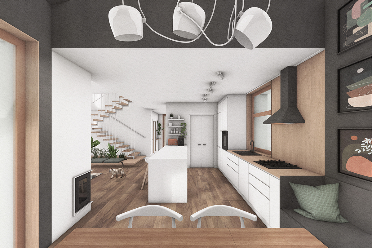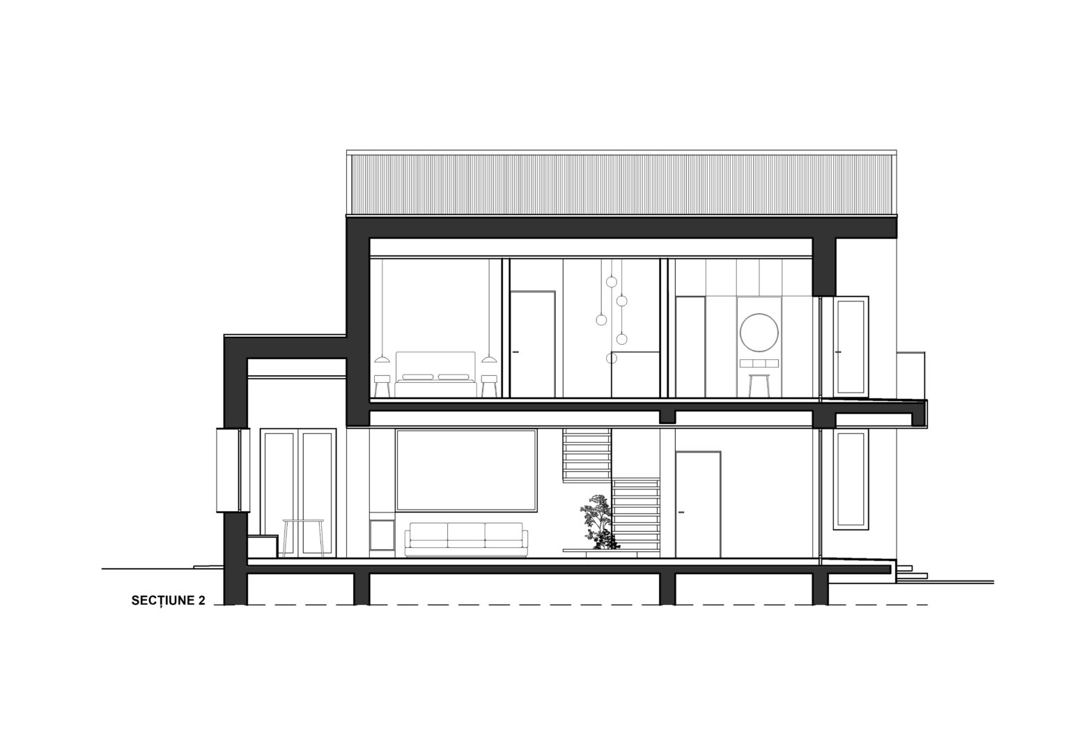 Un volum simplu, ușor de întreținut, eficient, acoperit cu tablă și lemn, adăpostește un acasă fără spații inutile, dar cu spațiu suficient și luminos, croit pe măsura și bucuria familiei.