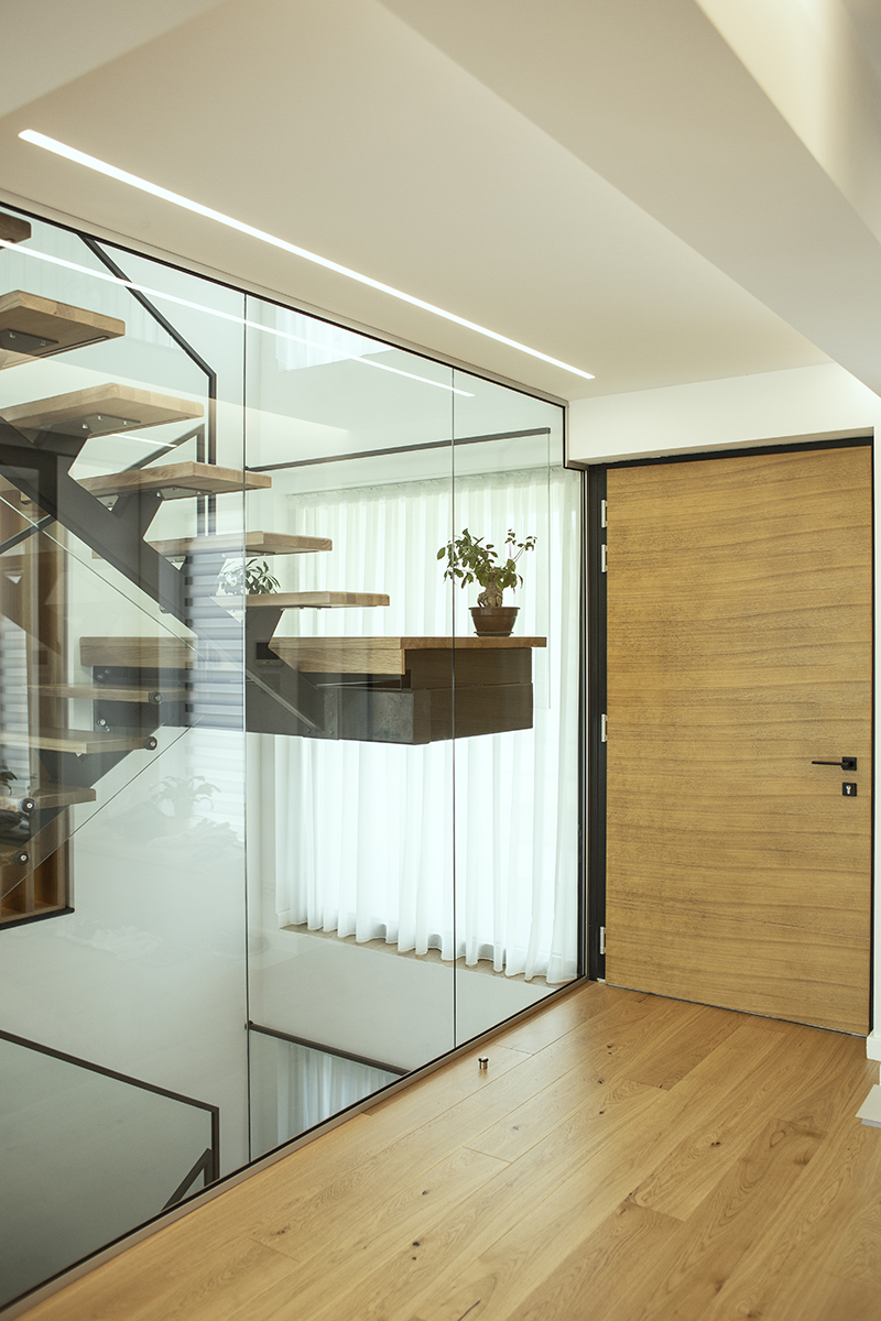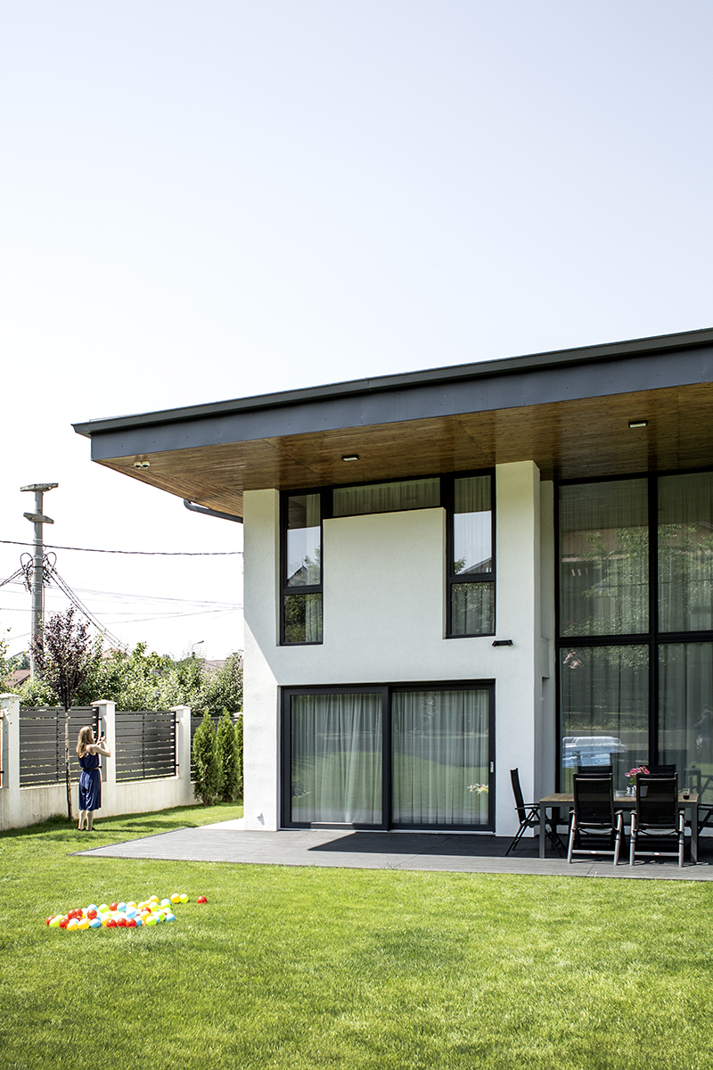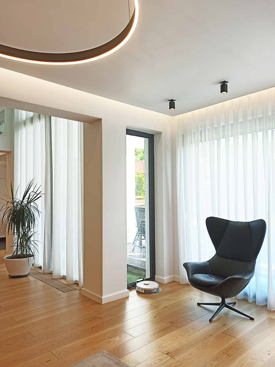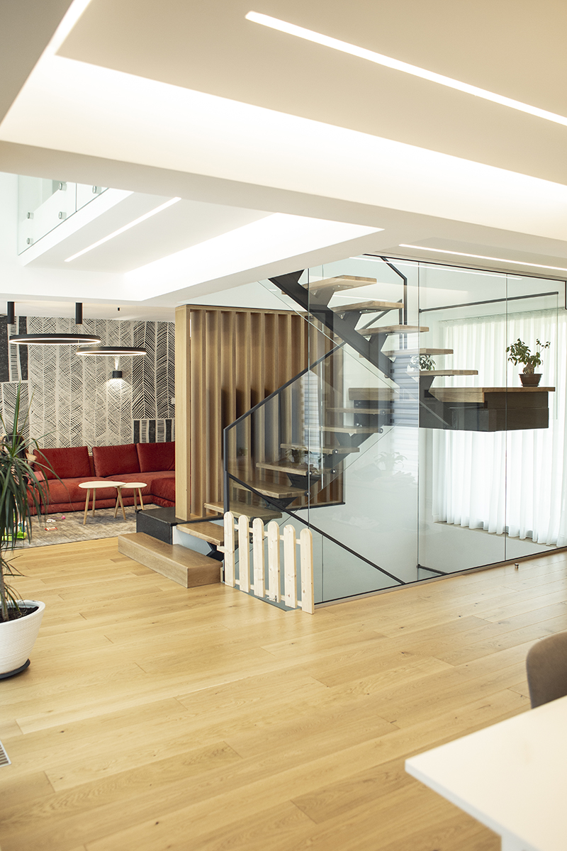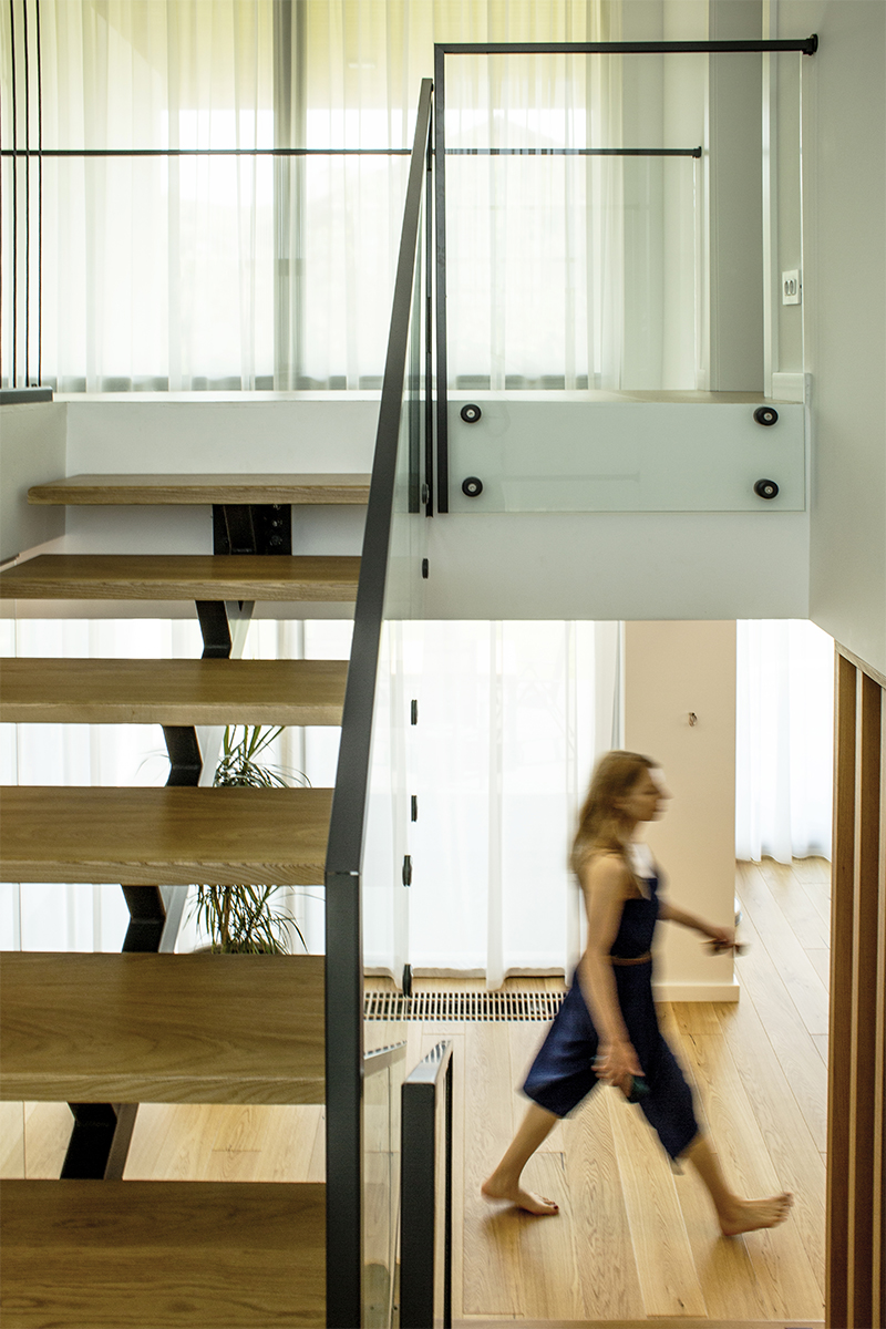 Spațiile interioare sunt conectate și armonizate prin centrul casei, o deschidere pe două niveluri și cu un amplu vitraj, care aduce în interiorul casei o curte interioară verde, un colț de natură.