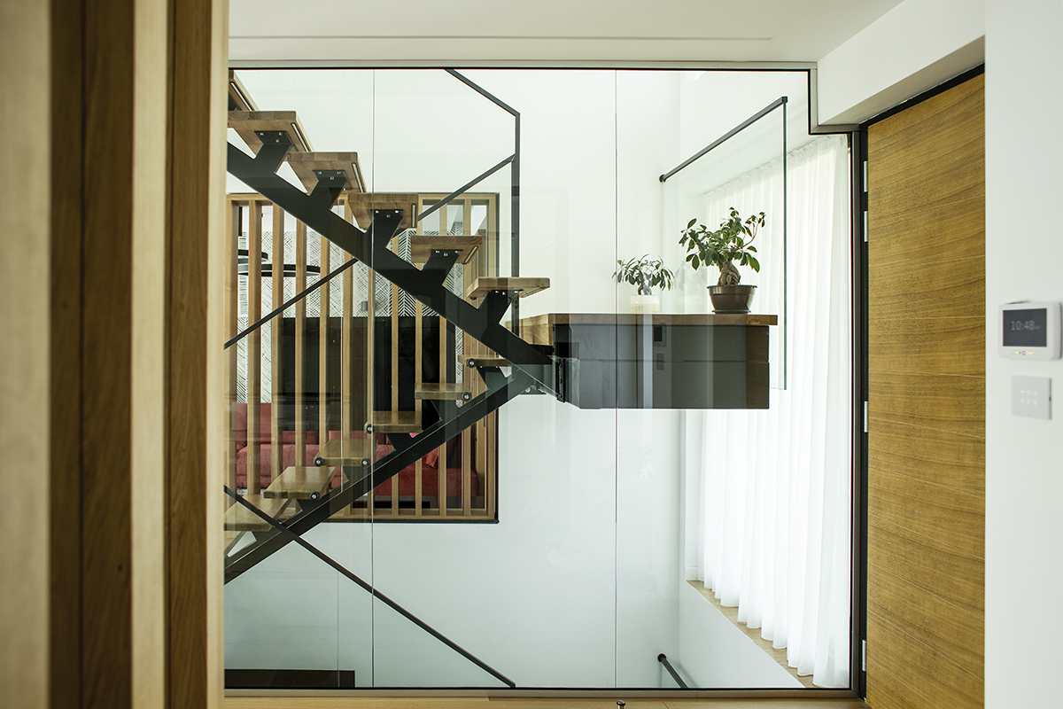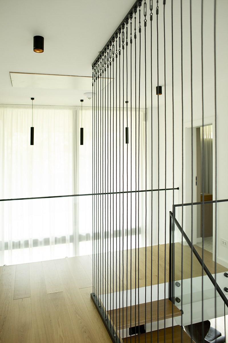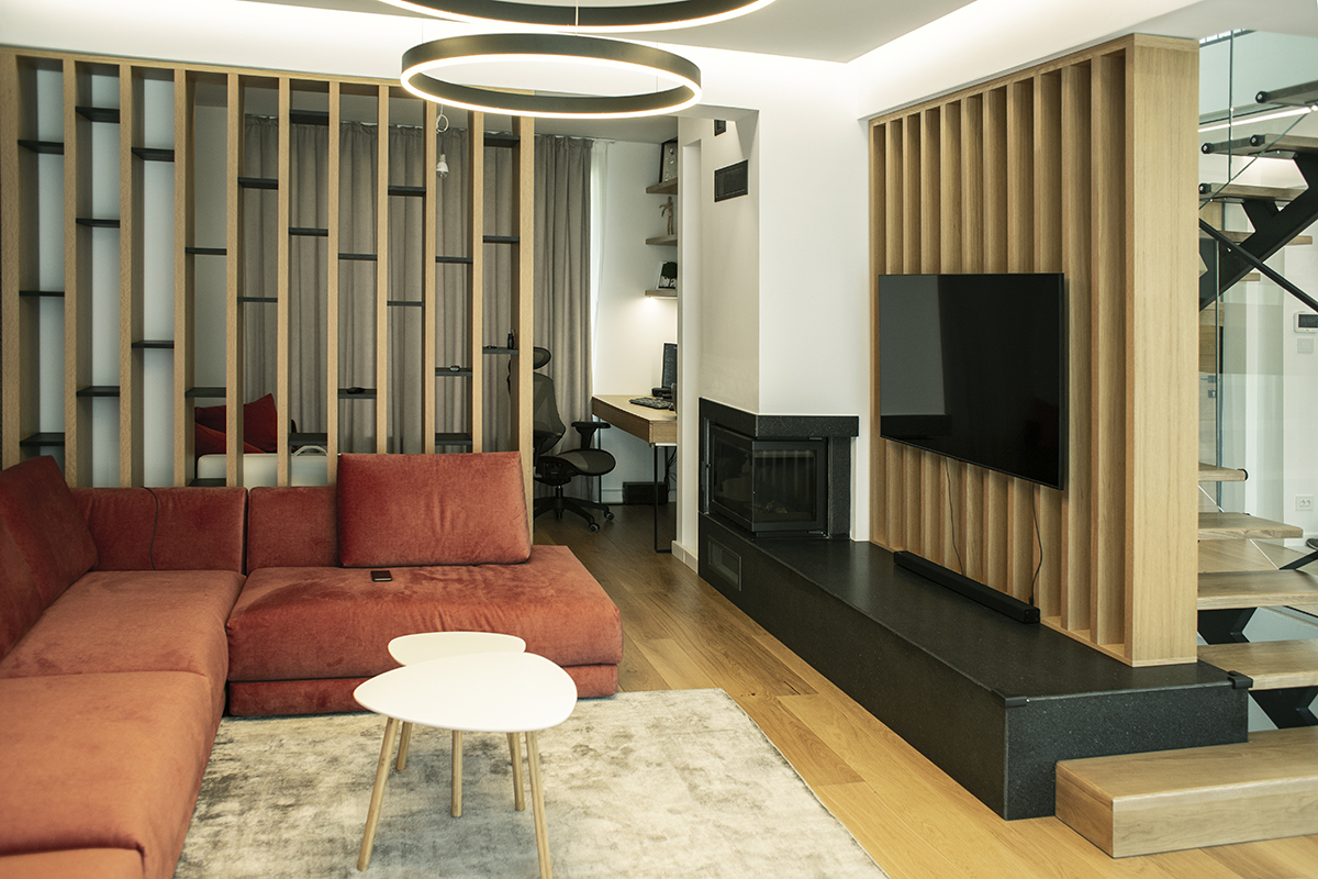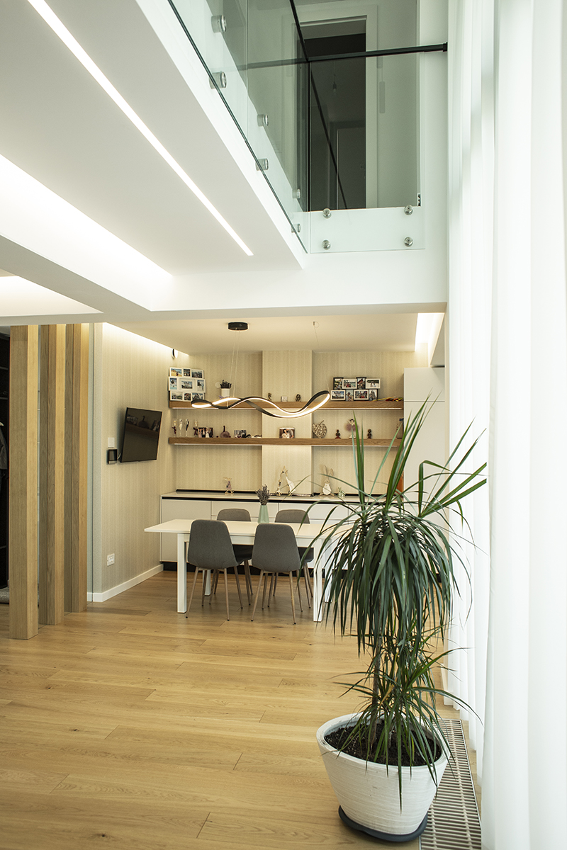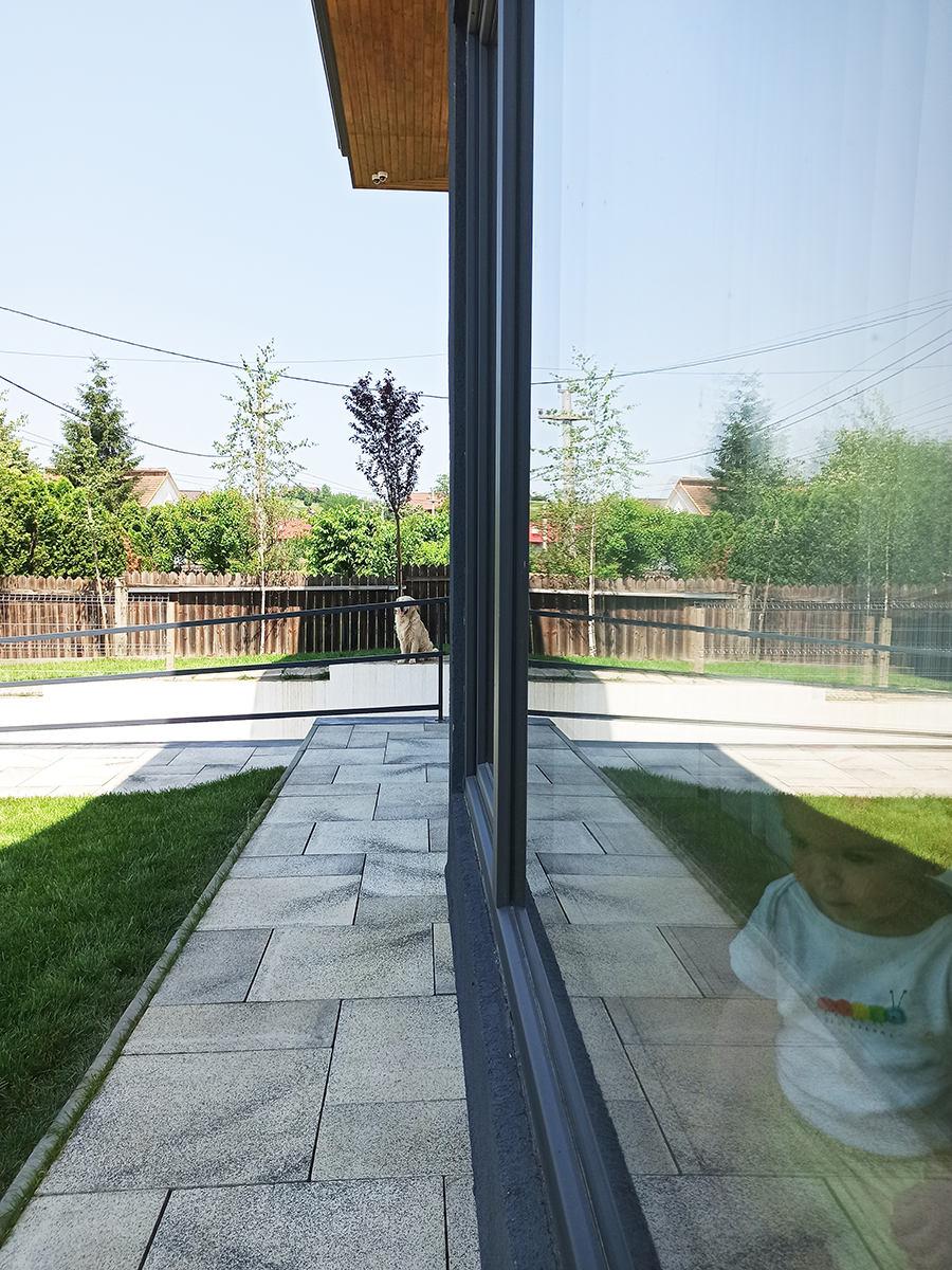 Spațiile interioare sunt conectate și armonizate prin centrul casei, o deschidere pe două niveluri și cu un amplu vitraj, care aduce în interiorul casei o curte interioară verde, un colț de natură.