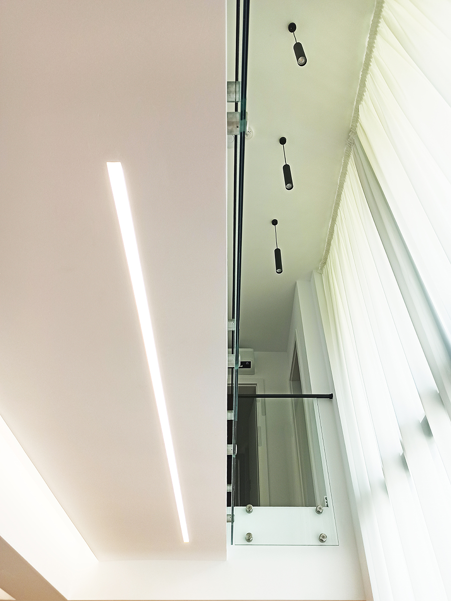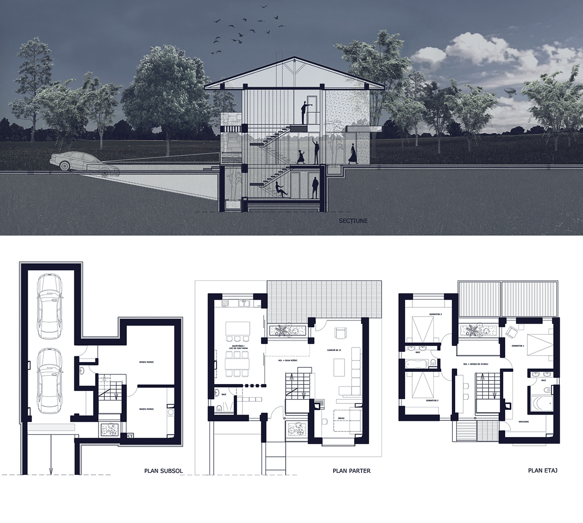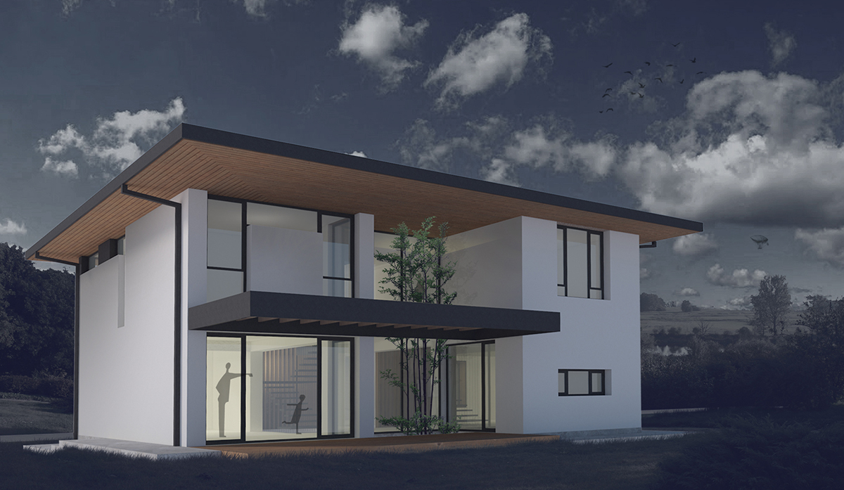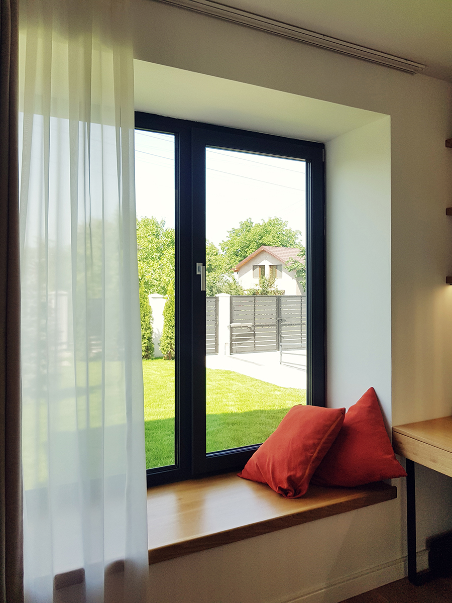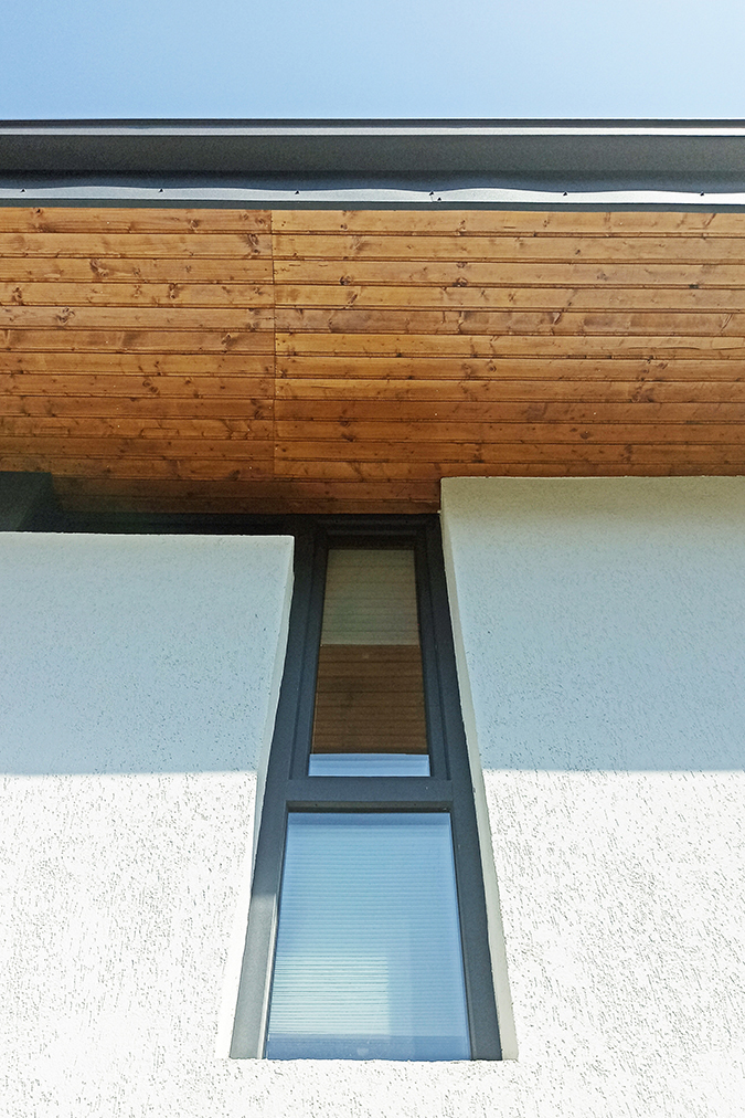 Spațiile interioare sunt conectate și armonizate prin centrul casei, o deschidere pe două niveluri și cu un amplu vitraj, care aduce în interiorul casei o curte interioară verde, un colț de natură.