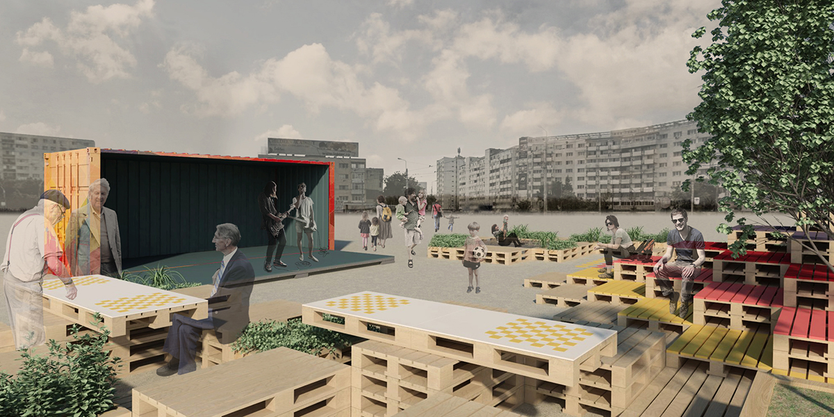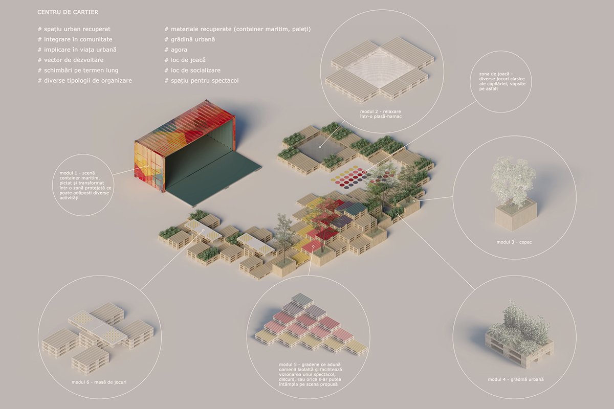 Prin acest exercițiu, am realizat un concept ce credem noi că ar putea recupera spațiile reziduale din cartiere, spații ce nu au o destinație clară. Imaginăm condițiile care pot duce la intărirea spiritului comunitar, un spațiu unde se pot întâlni să-și petreacă timpul liber copiii, părinții, bunicii, persoanele singure ce au nevoie de socializare, unde cetățenii pot discuta și pot lua decizii publice; o scenă pentru instituțiile care doresc să dezbată cu locuitorii idei de îmbunătățire a vieții cartierului și orașului.