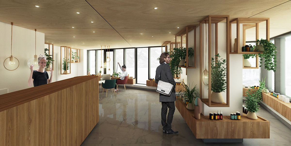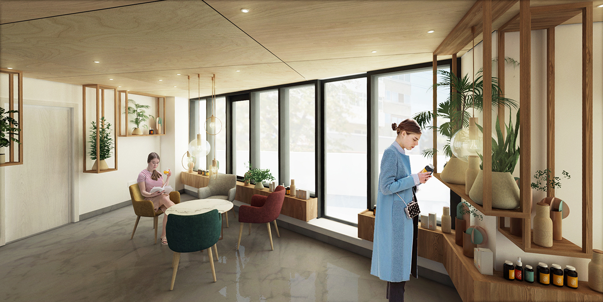 În ton cu atitudinea clasică de a transforma un dezavantaj în avantaj, am profitat de pardoseala reflexivă pentru a oglindi de această dată culoarea caldă a tavanului placat cu lemn, pervazul devine zonă de expunere în lipsa pereților, iar amplul vitraj face ca magazinul să fie o mare vitrină. Liniile simple și clare ale mobilierului, materialele calde, sursele de iluminare și vegetația scot în evidență produsele și tot ce acestea reprezintă- natural, sănătate, îngrijire.