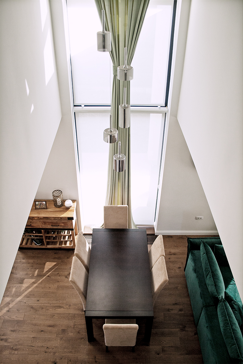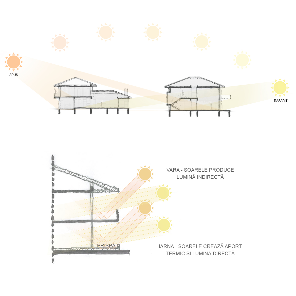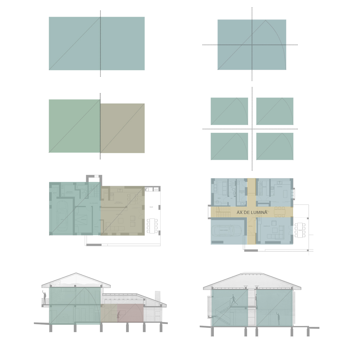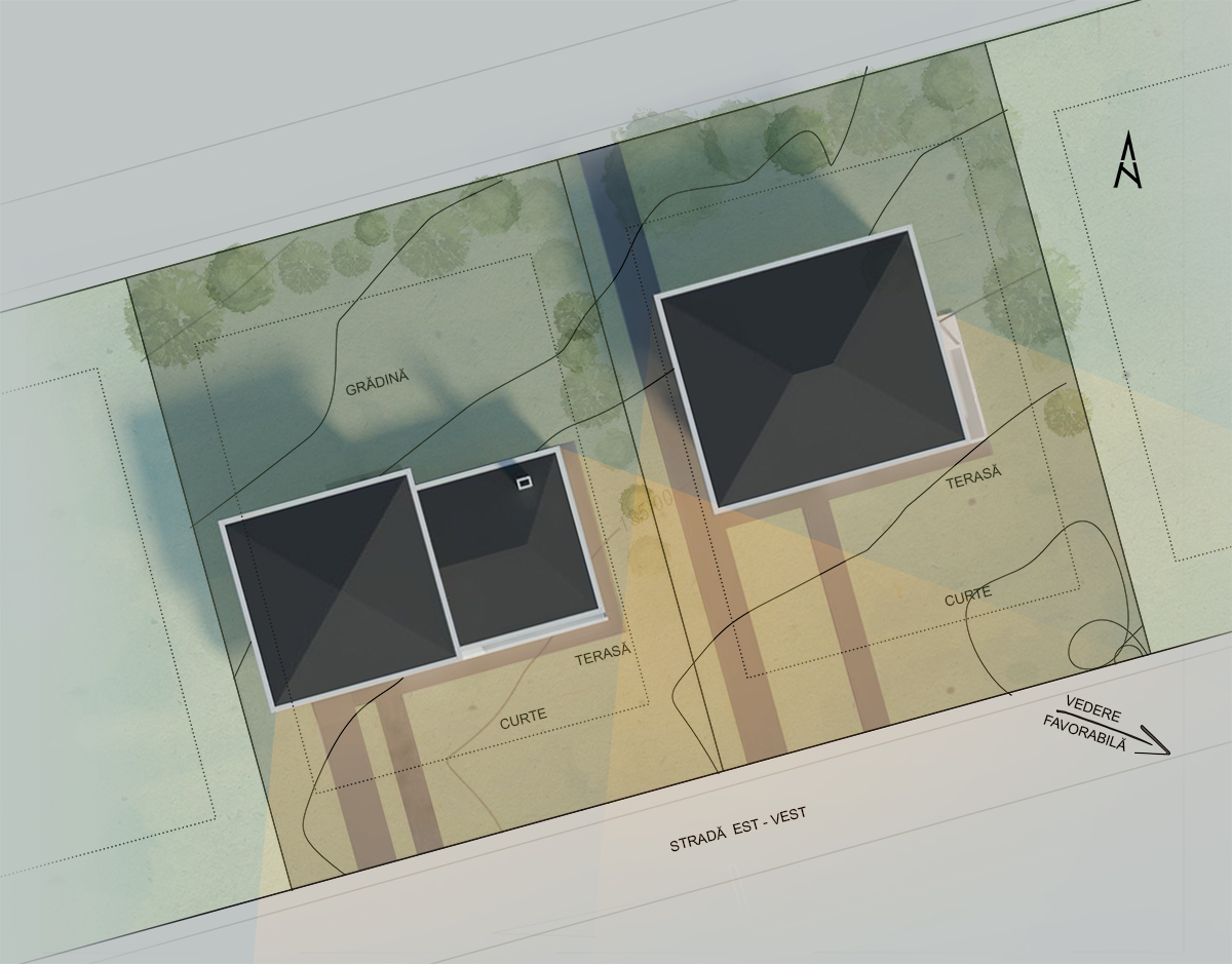Poziționarea decalată pe teren a permis obținerea unei orientări favorabile pentru spațiile interioare, astfel încât ambele zone de zi să aibă deschidere spre vale. Pentru a forma un ansamblu, au fost armonizate prin crearea unor volumetrii cu elemente de limbaj comune și prin alegerea finisajelor exterioare.