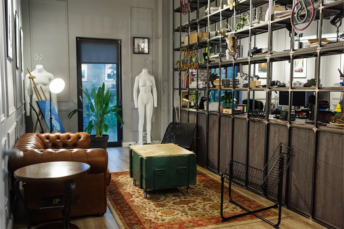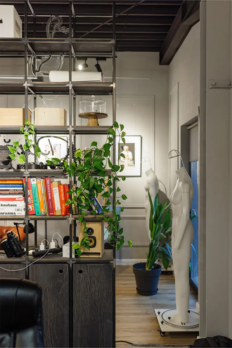 Am ales utilizarea a două tipologii de mobilier, cel custom, reprezentat de o serie de biblioteci, ce întrunesc pe de o parte rolul de depozitare , dar și de elemente de compartimentare, delimitând diferite zone, fără a întrerupe conexiunea vizuală. Designul propus este potențat de prezența corpurilor de mobilier, cele de iluminat unicat și a obiectelor decorative, recuperate și reutilizate în acest context. Materialele brute, elementele autentice și plantele, aduse împreună, se armonizează în spațialitatea deja existentă.