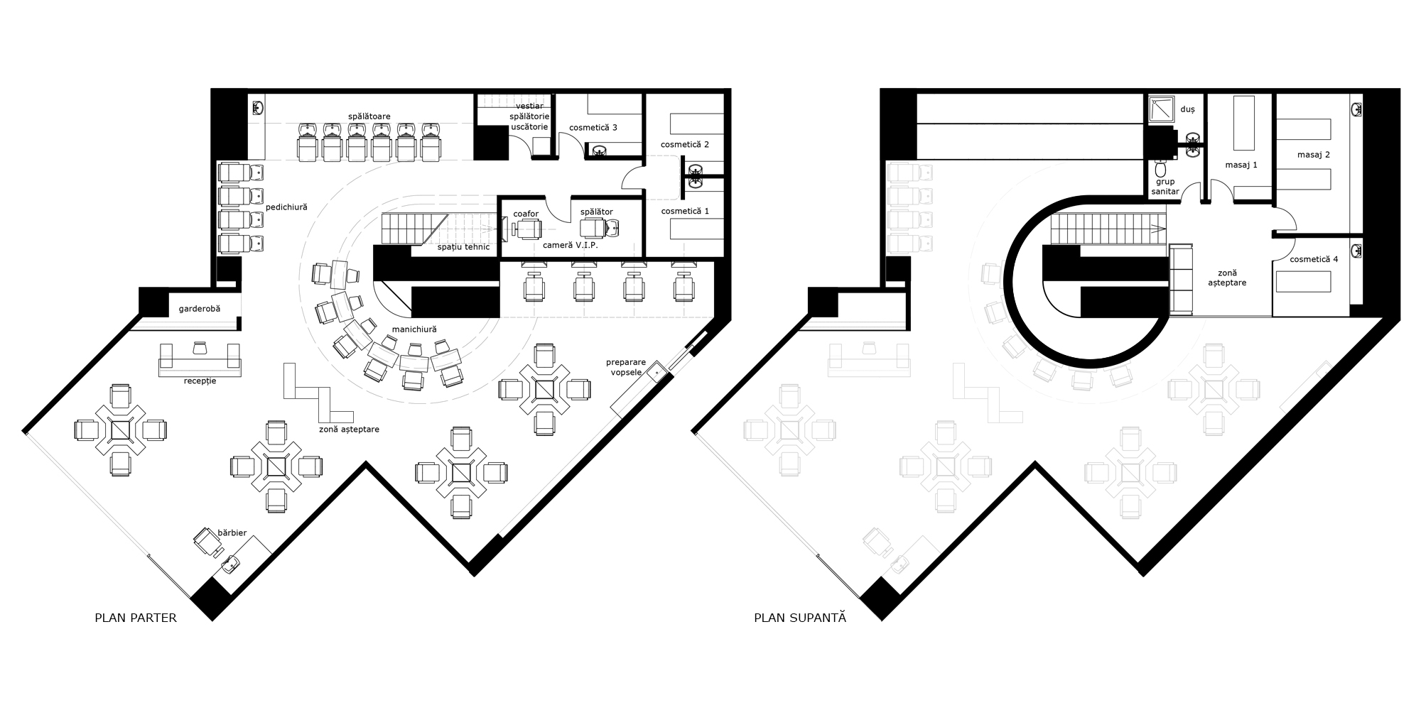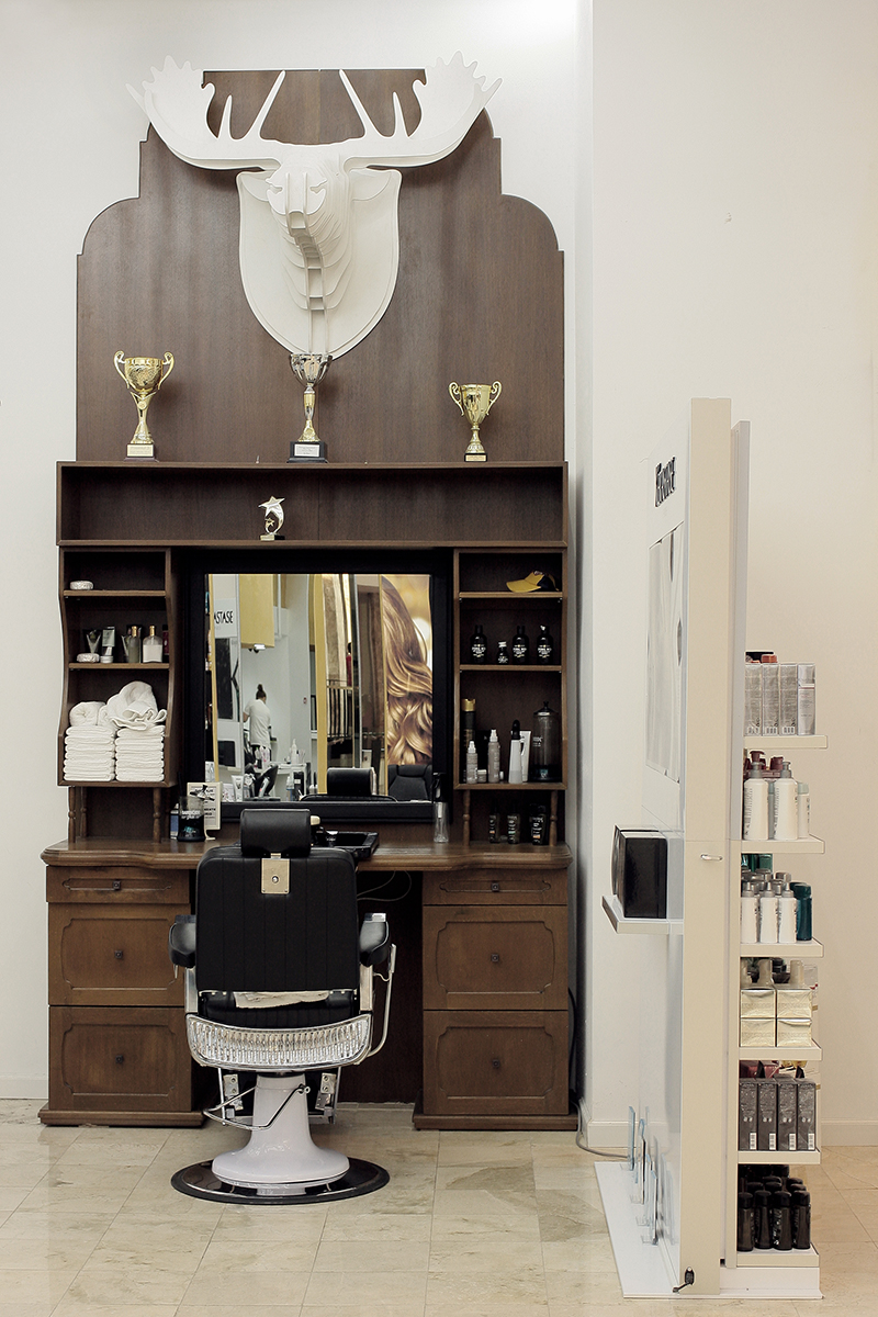 Tocmai acestă deschidere a dus la ideea de a face un spectacol din activitățile ce se desfășoară înăuntru, de a duce înfrumusețarea la nivel de artă, astfel că spațiul este unul deschis, de-a lungul său desfășurându-se și intersectându-se diversele funcțiuni, de la impunătorul post de barber, elegantele insule de frizerie și coafor, până la posturile de manichiură dispuse în jurul unui tambur ce devine centru de greutate. Acest cilindru de care este atașată scara către supantă este și punctul de articulare între zonele deschise, de spectacol și cele ce au nevoie de o anumită intimitate.